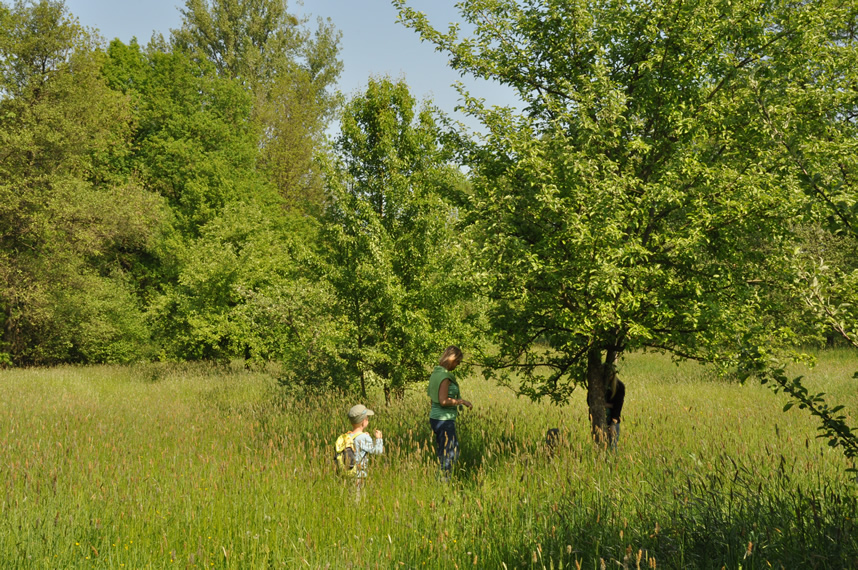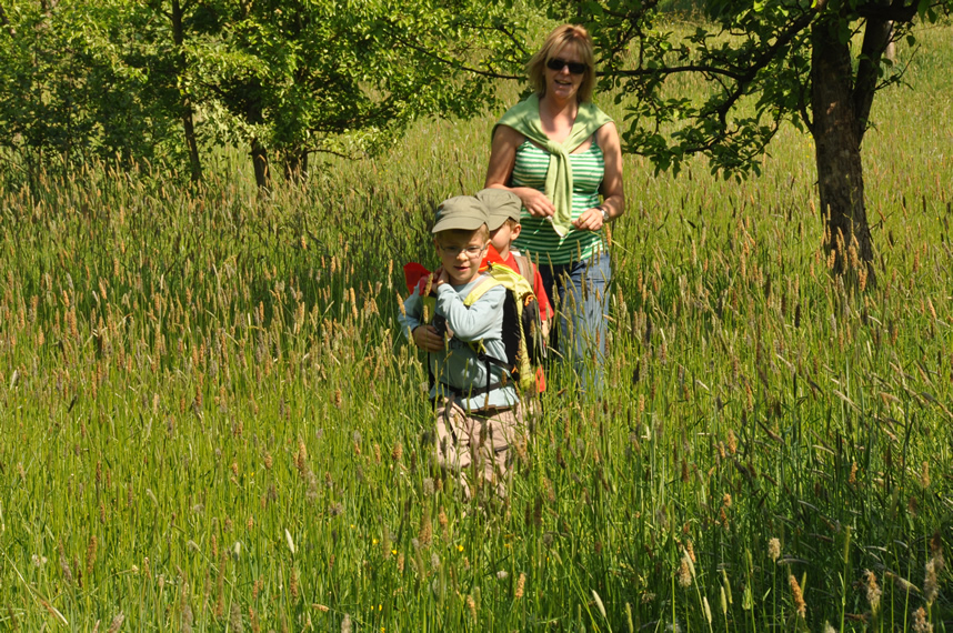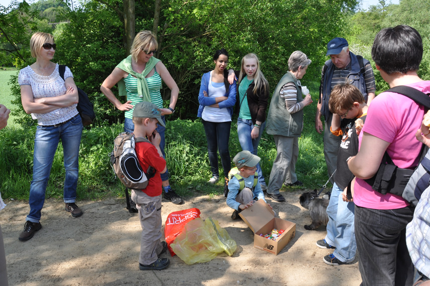 Nachdem wir die letzten Häuser hinter uns gelassen haben, waren dann aber erst einmal die jüngsten Wanderer gefordert. Auf einer Streuobstwiese am Hanfbach galt es im hohen Gras den IGW Wandertag Schatz zu heben. Nicht nur die Jugend, sondern auch die Erwachsenen waren glücklich, als der Schatz dann gefunden und unter allen Wandersleuten aufgeteilt werden konnte – Schokororiegel, Gummibärchen und andere Leckereien waren eine schöne Belohnung für die erfolgreich absolvierte 1. Etappe.