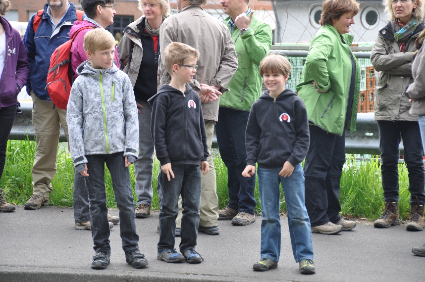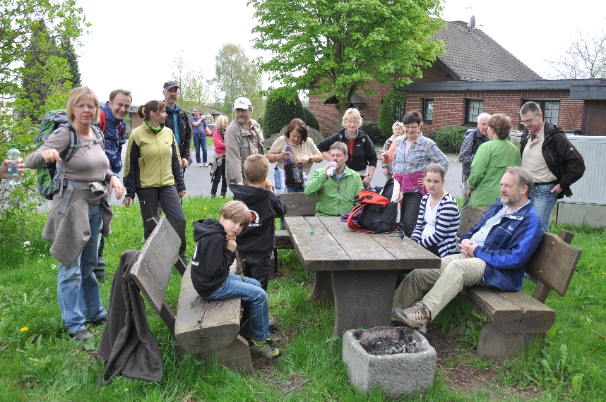 Immer mal wieder hatten wir einen sehr schönen Blick auf die Wahnbachtalsperre, insbesondere an dem Aussichtspunkt am Münchenberg bei Pinn, wo wir auch unsere Rast einlegten. Leider fehlen hier allerdings Bänke zur Erholung. Im schönen Sackgassendorf Pinn saßen die wenige Dorfbewohner bei Ihrem Maifest zum Grillen zusammen. Wir haben bei den Dorfkindern den Wegezoll mit einem kleinen Teil, des zuvor von unseren Wanderkindern im Wald „ausgehobenen“ Süßigkeitenschatz, entrichtet.