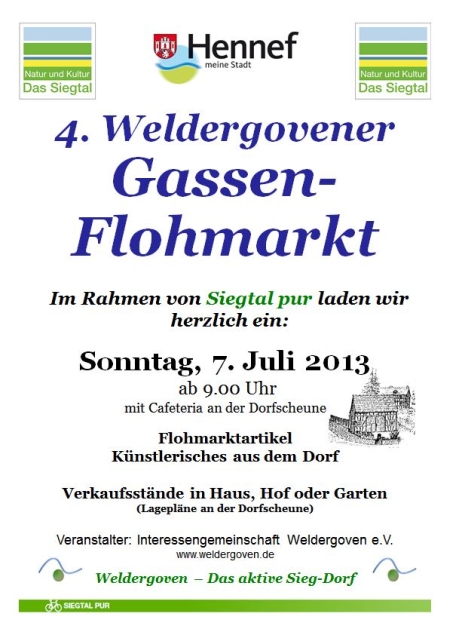 Auch in diesem Jahr veanstalten wir den Weldergovener Gassenflohmarkt als inzwischen feste Größe im Hennefer Rahmenprogramm von “Siegtal pur”, dem jährlich veranstalteten autofreien Siegtal.