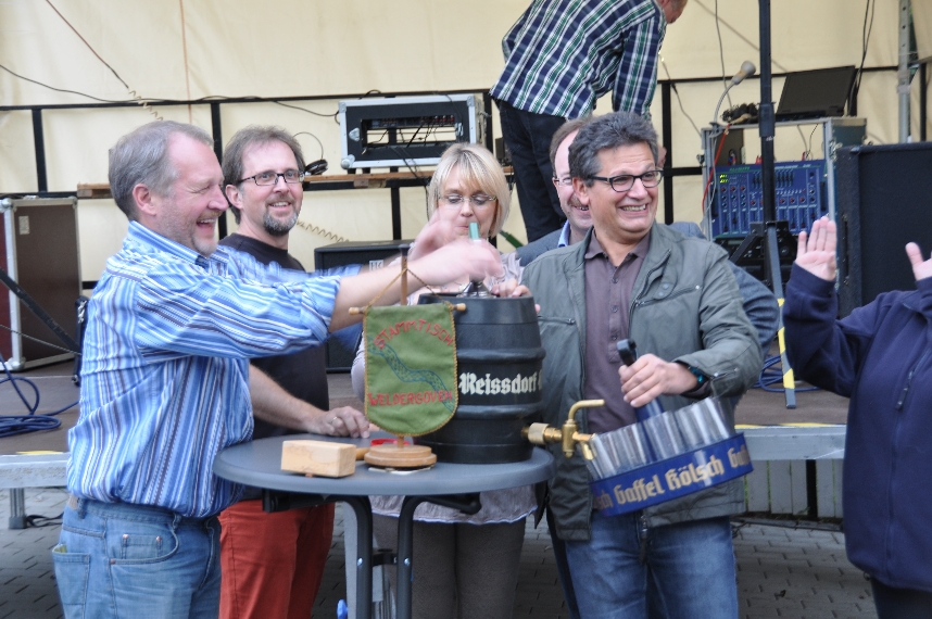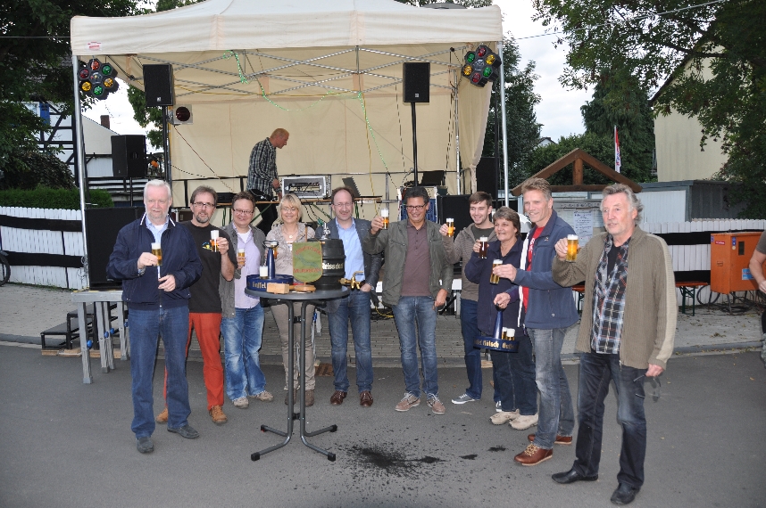Bürgermeister Klaus Pipke (5.v.r.), seine beiden Vertreter, Ratsmitglieder und der IGW-Vorstand beim Fassanstich zum Scheunenfest