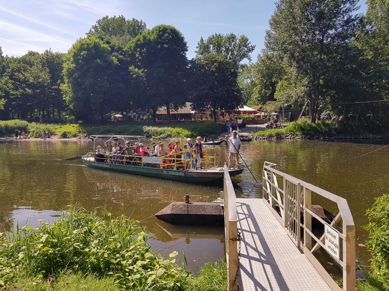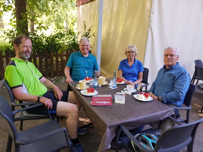Im Restaurant „Zur Siegfähre“ wartete der reservierte Tisch auf uns, der wunderschön gelegen unter Bäumen im Garten stand. Hier ließen wir es uns eine Dreiviertelstunde bei Kaffee und leckerem Erdbeerkuchen gut gehen.