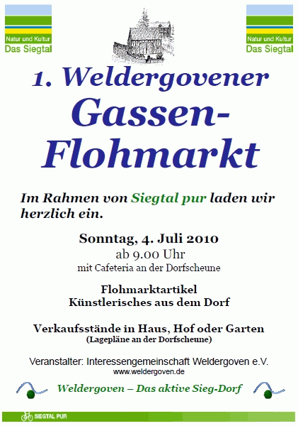 Zum ersten Mal veranstaltet die IG Weldergoven am Sonntag, den 4. Juli 2010 ab 9:00 Uhr im Rahmen von „Siegtal pur“ einen Gassenflohmarkt. Von zahlreichen Teilnehmern werden Flohmarktartikel und Künstlerisches aus dem Dorf angeboten. Für das leibliche Wohl gibt es eine Cafeteria in der Dorfscheune. Hier sind natürlich auch alle Radfahrer willkommen, die sich, ein wenig abseits der offiziellen Fahrrad-Strecke, stärken möchten. An der Scheune ist auch der Ausgangspunkt für den Flohmarkt, denn hier gibt es einen Lageplan über die Flohmarkt-Stände, die sich teilweise dezentral, vor den Häusern, in den Höfen oder Gärten der Mitwirkenden befinden. Wer Weldergoven an diesem Tag mit dem Auto, und nicht mit dem Fahrrad, erreichen möchte, kann dies nur über die Ortseinfahrt von der B 478 (Bröltalstraße) aus, da die (L333) Blankenberger Str. an diesem Tag für Autofahrer wegen der Veranstaltung „Siegtal pur“ gesperrt ist.